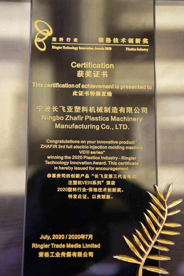 宁波波长飞亚塑料机械制造有限公司的VEIII系列全电动注塑机在众多竞品中脱颖而出,荣获“2020塑料行业-荣格技术创新奖”。宁波长飞亚副总经理金镖先生,向主办方荣格工业传媒表示了衷心的感谢:“我们非常荣幸能获得此次‘2020塑料行业-荣格技术创新奖’,这是对长飞亚品牌以及VE系列电动注塑机产品的高度肯定,也将进一步激励我们整个团队,持续探索电动注塑技术的无限可能,继续为客户提供能切实解决其实际所需的解决方案,实现价值共创。”